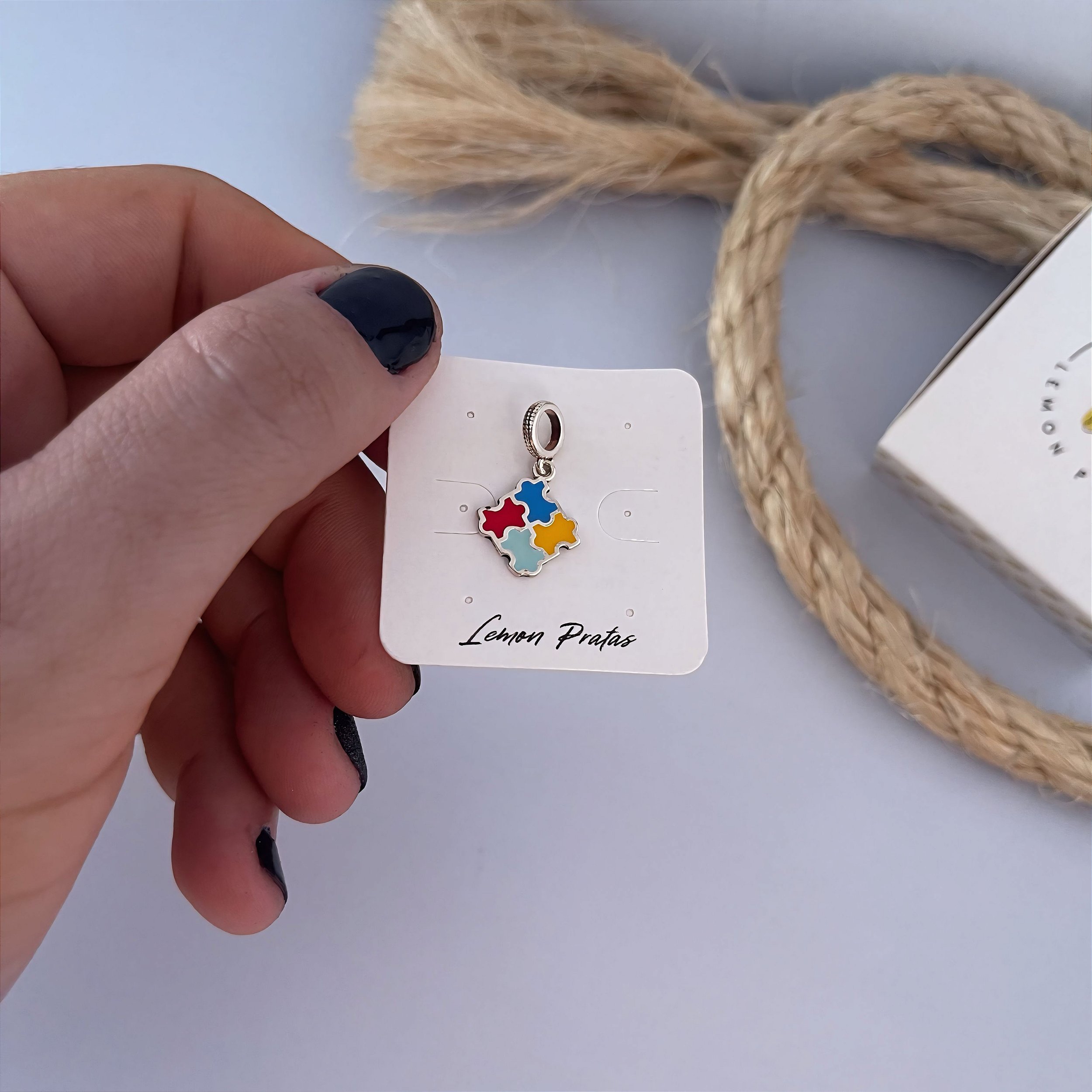 Berloque em Prata 925, com detalhes de pecinhas de quebra-cabeça desenhado em resina, um berloque elegante e significativo.