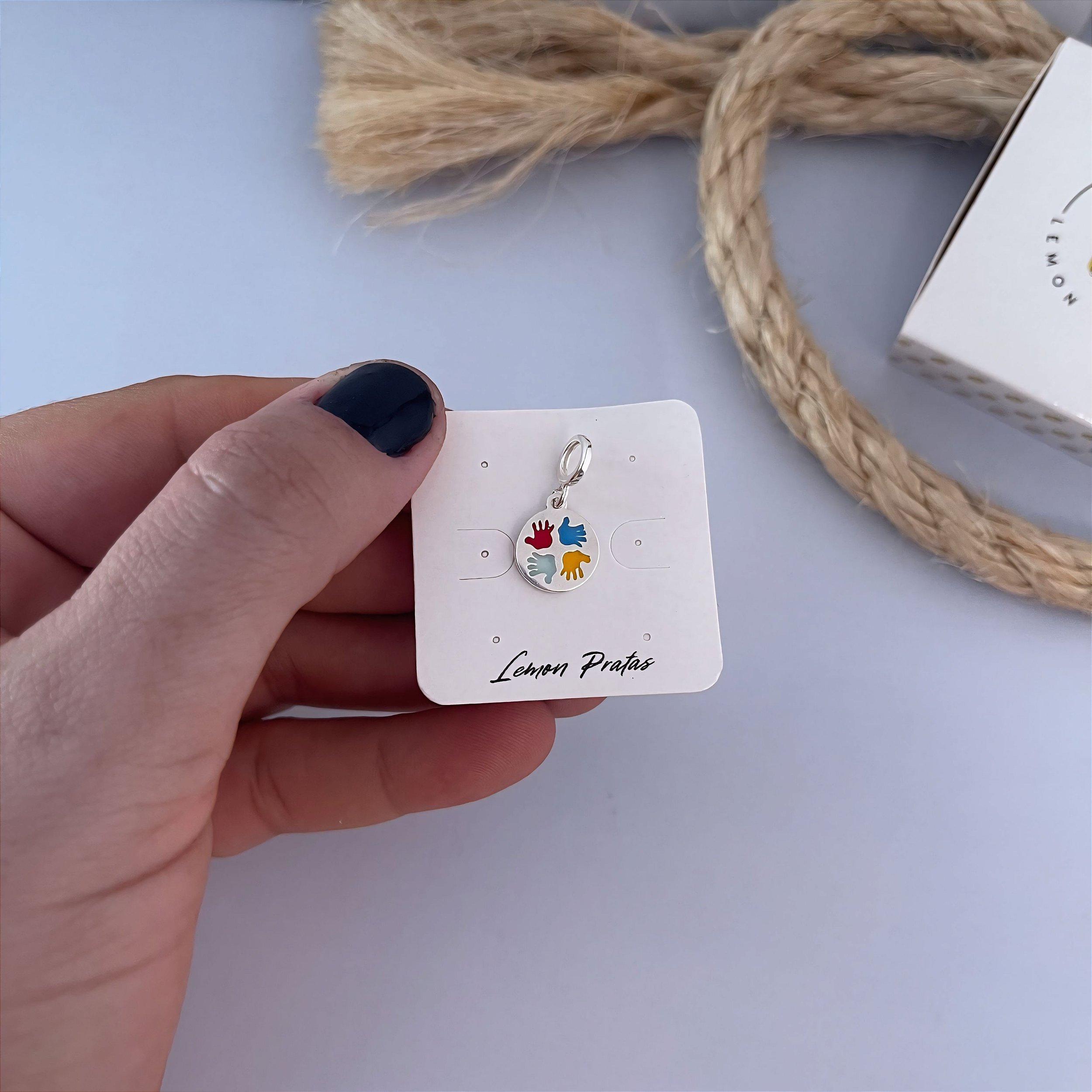 Berloque em Prata 925, com detalhes de mãozinhas desenhado em resina, um berloque elegante e significativo.