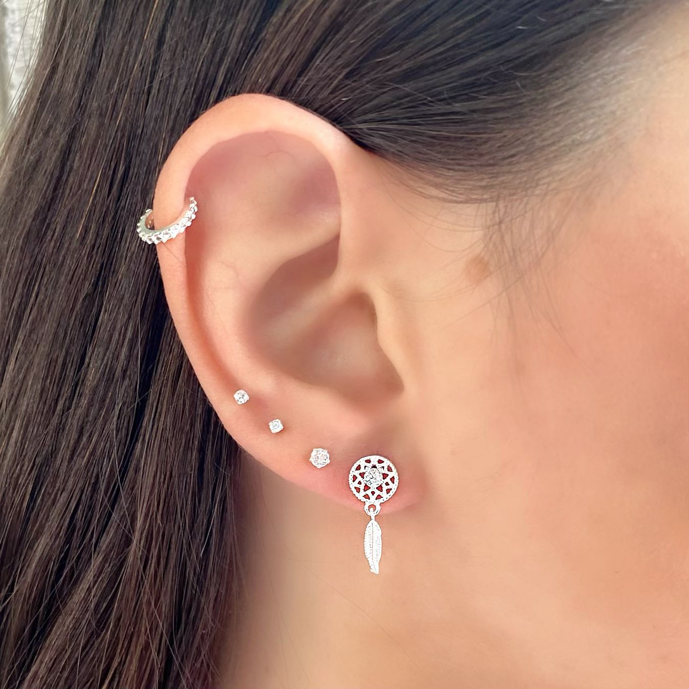 Este brinco apresenta o icônico aro entrelaçado com fios, formando uma teia que captura os sonhos bons e permite que os ruins passem. Cada detalhe é elaborado com cuidado, transmitindo a riqueza espiritual e a conexão com a natureza que o filtro dos sonhos representa.