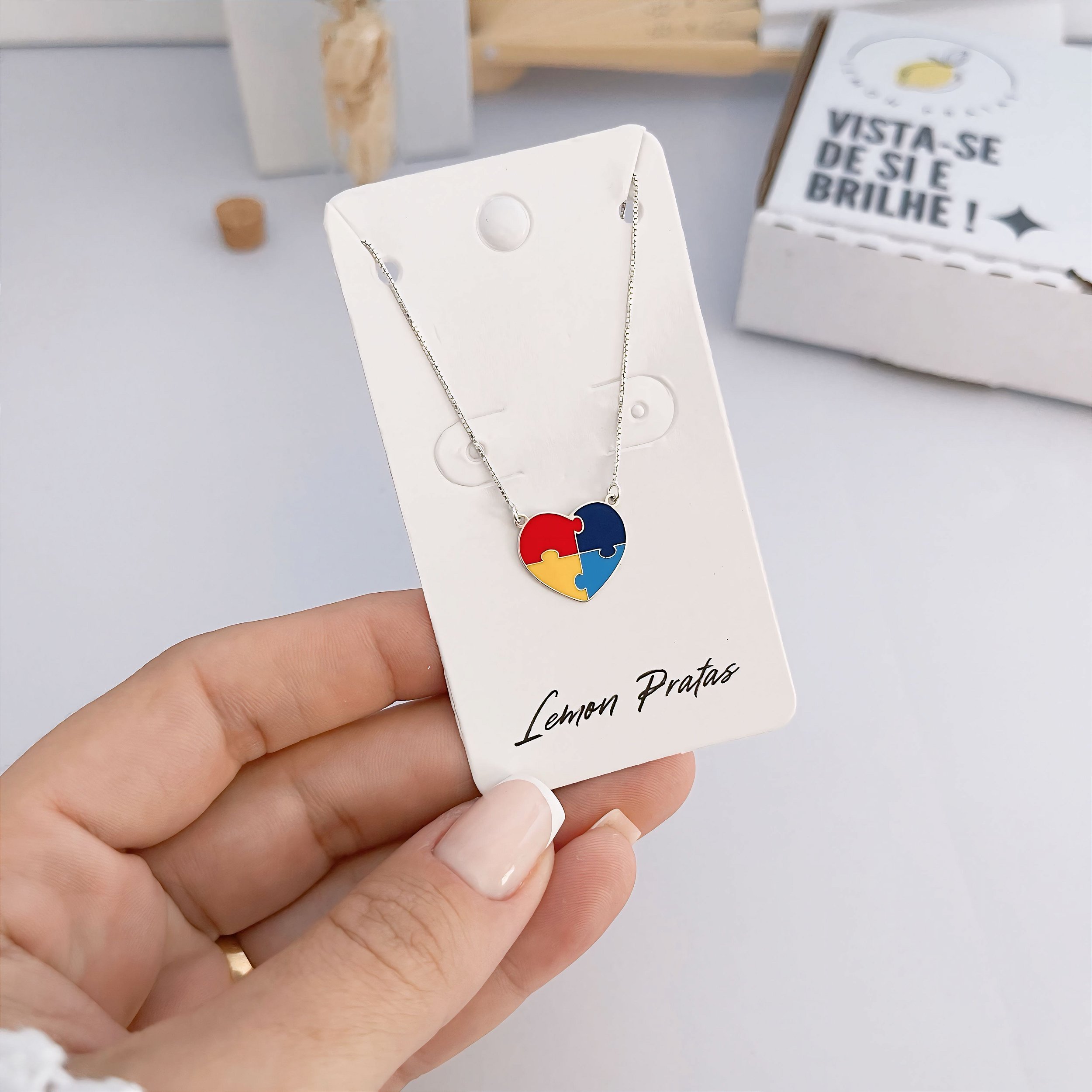 Colar autismo em Prata 925, feito na corrente veneziana 40cm apresenta um pingente em forma de coração quebra-cabeça resinado elegante e significativo.