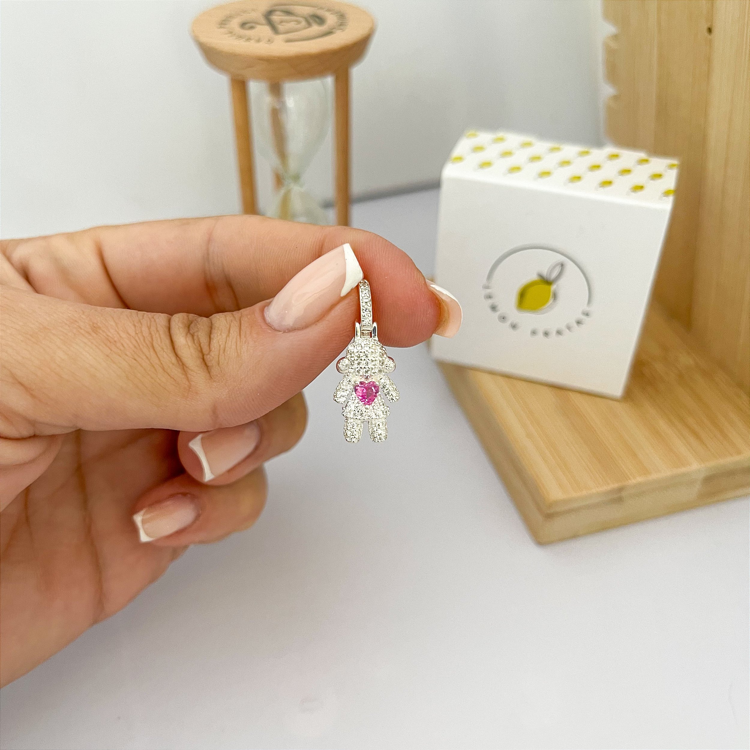 Um pingente delicado em forma de menina, inteiramente cravejado com pequenas zircônias cristais que brilham intensamente. No centro do pingente, há um coração rosa vibrante, cuidadosamente inserido, que contrasta com o brilho claro das zircônias ao redor. O detalhe do coração rosa no meio adiciona um toque de cor e simbolismo ao design, tornando o pingente uma peça encantadora e significativa