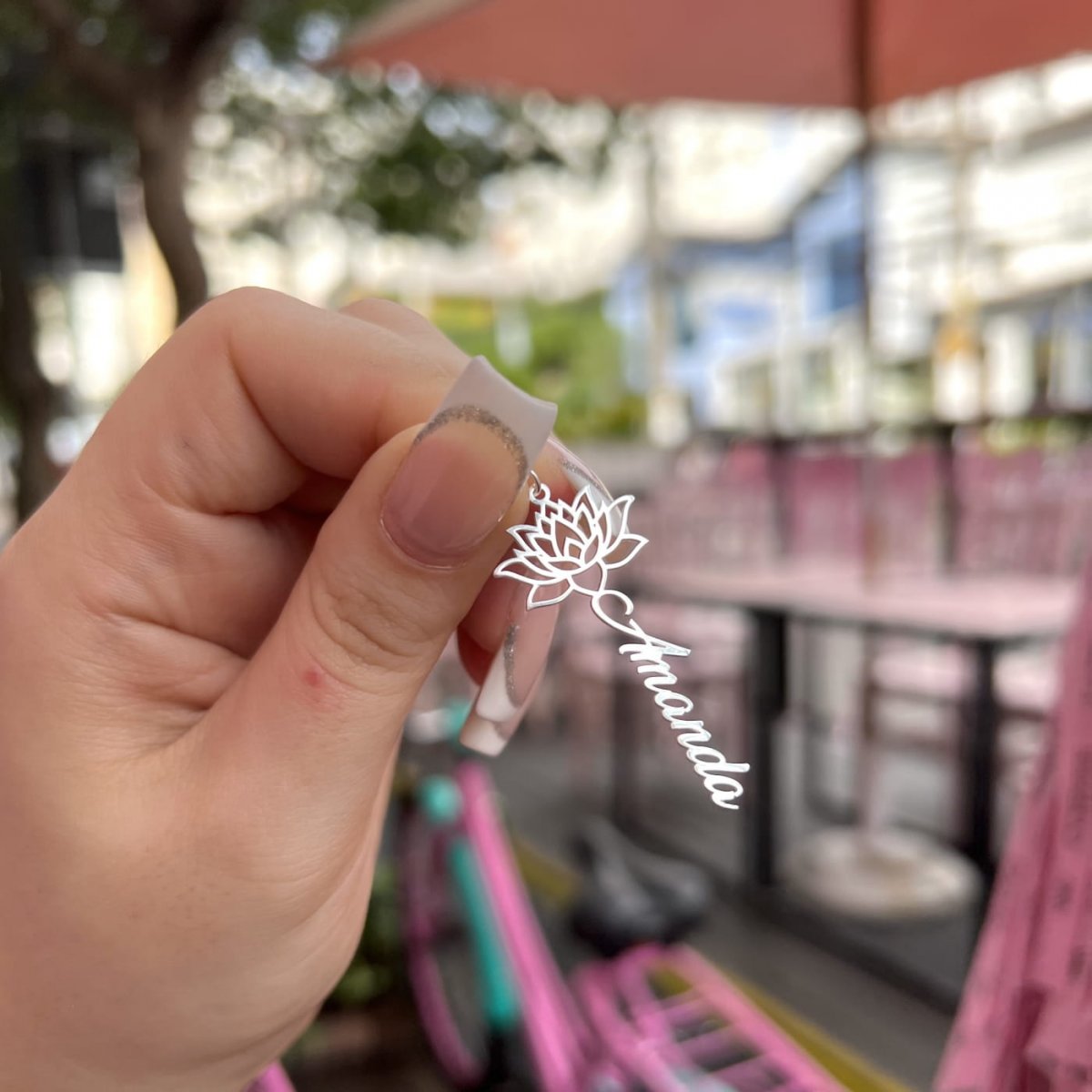 Pingente nome fonte lótus, é uma joia no qual você pode personalizar com até 13 caracteres.