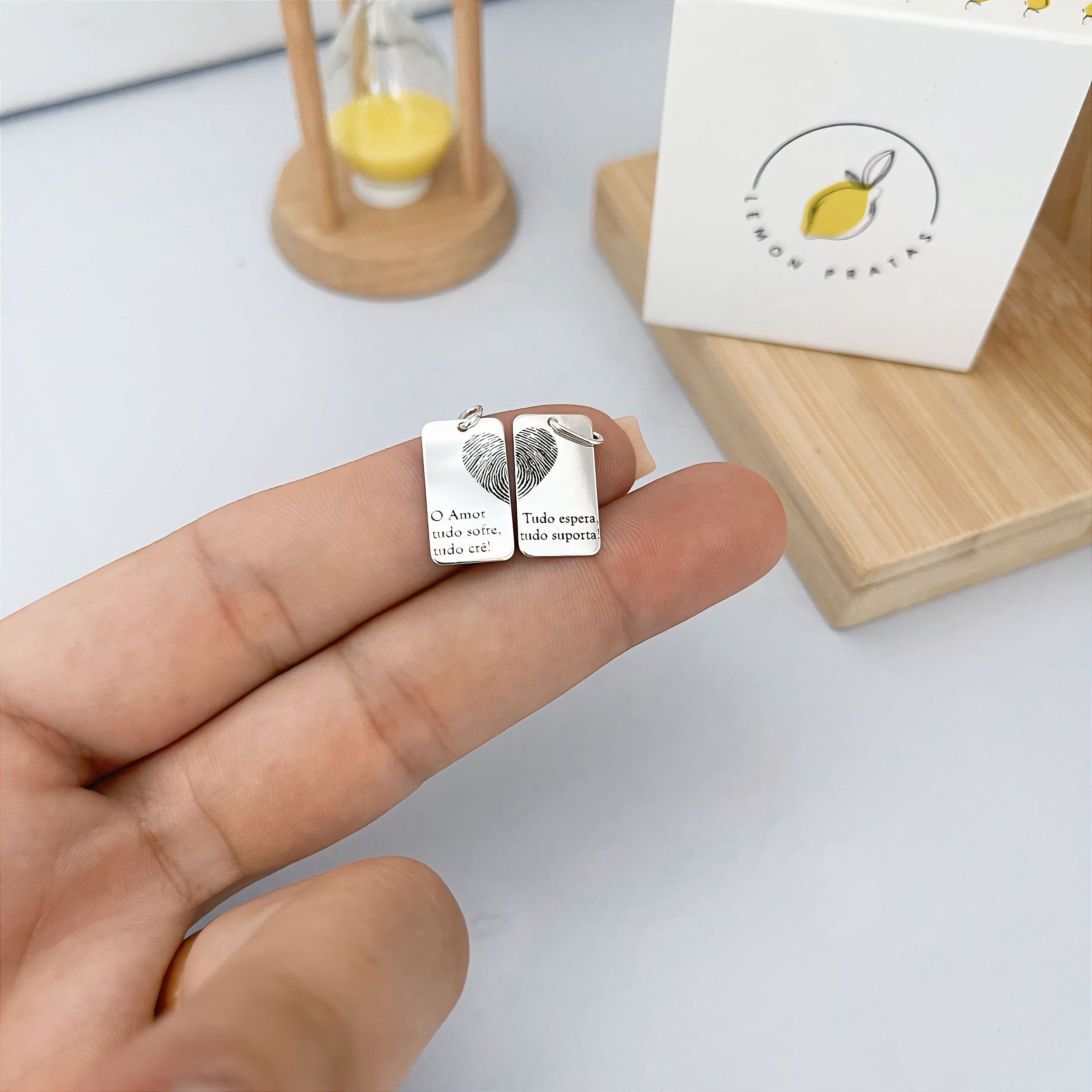 Pingente duplo com as digitais que formam um coração seria um acessório delicado e romântico. Ele é composto por duas partes que se encaixam perfeitamente para formar um coração completo. Cada metade do pingente também é composto por uma frase que se encaixa perfeitamente: “O amor tudo sofre, tudo crê!” “Tudo espera, tudo suporta”. Perfeito para simbolizar a união e o amor entre as duas pessoas.