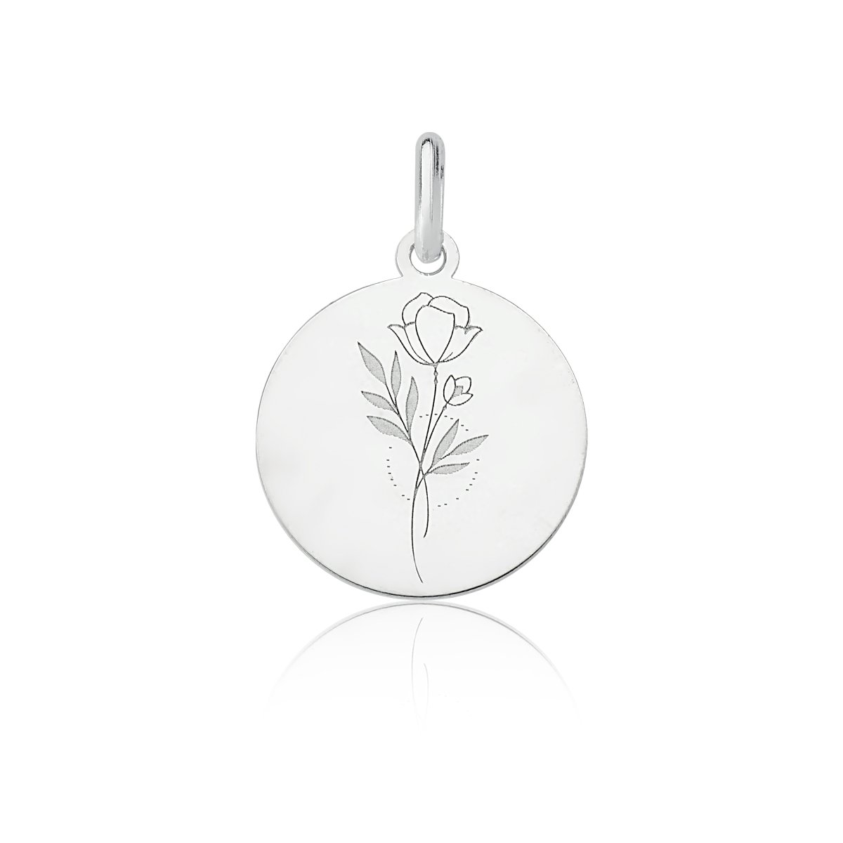 Este pingente cativante apresenta um design circular com uma rosa gravada em seu centro, simbolizando beleza, amor e renascimento. Sua gravação meticulosa adiciona uma dimensão de detalhe e arte que eleva sua singularidade.