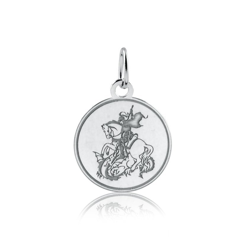 Pingente em formato de medalha São Jorge é retratado em uma postura heroica, com a lança em mãos, direcionada ao dragão aos seus pés.
